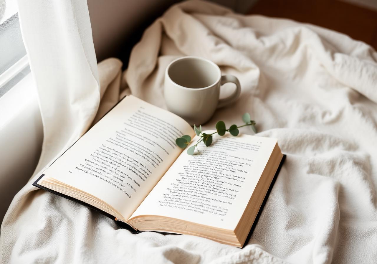 Otevřená kniha s šálkem čaje – klidné místo pro čtení a zamyšlení